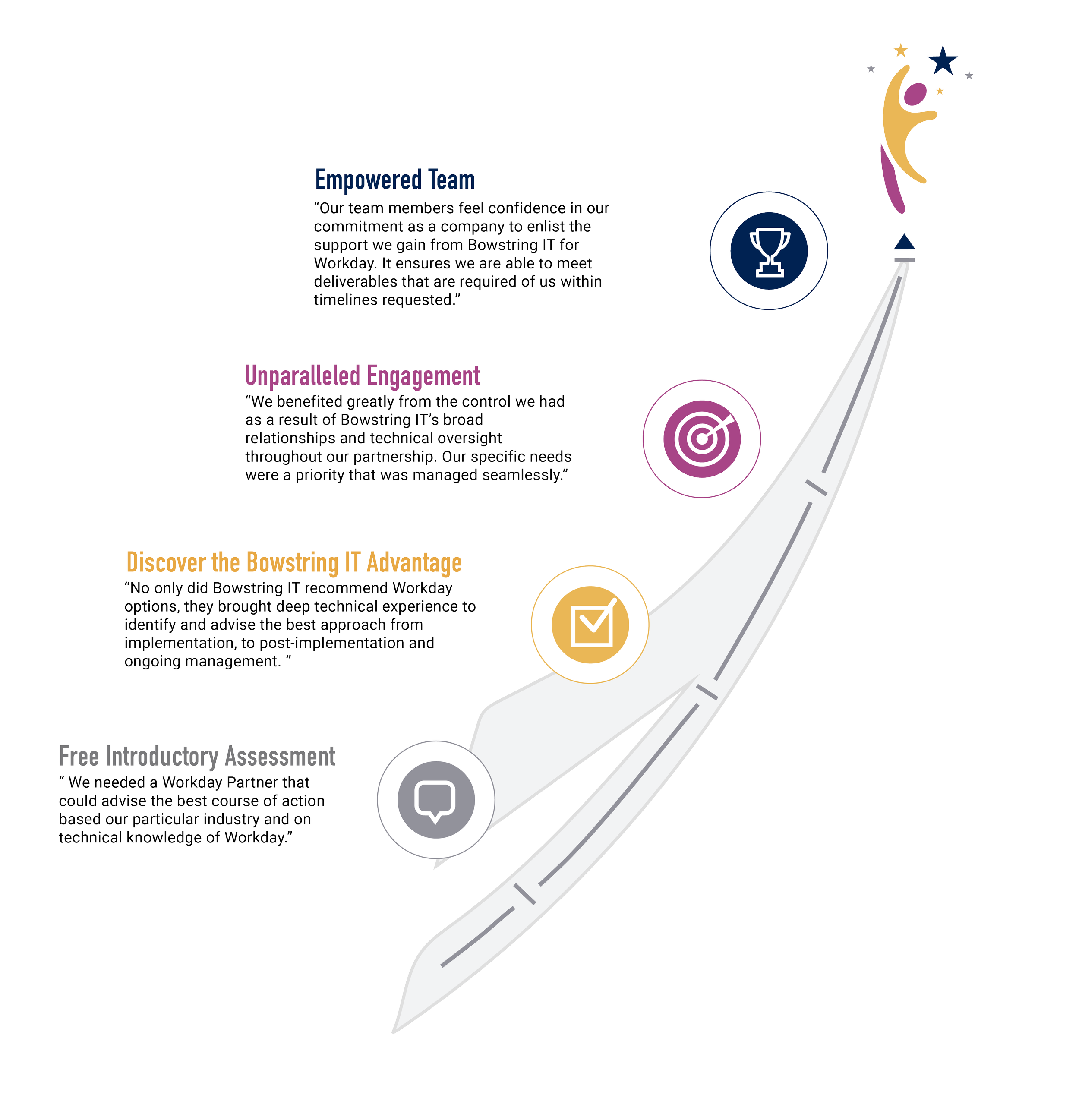 We develop a long-term plan that includes advisory support and a roadmap for your particular Workday requirements. including the adoption of new modules or features, implementation architecture, independent verification & validation, and best practices.